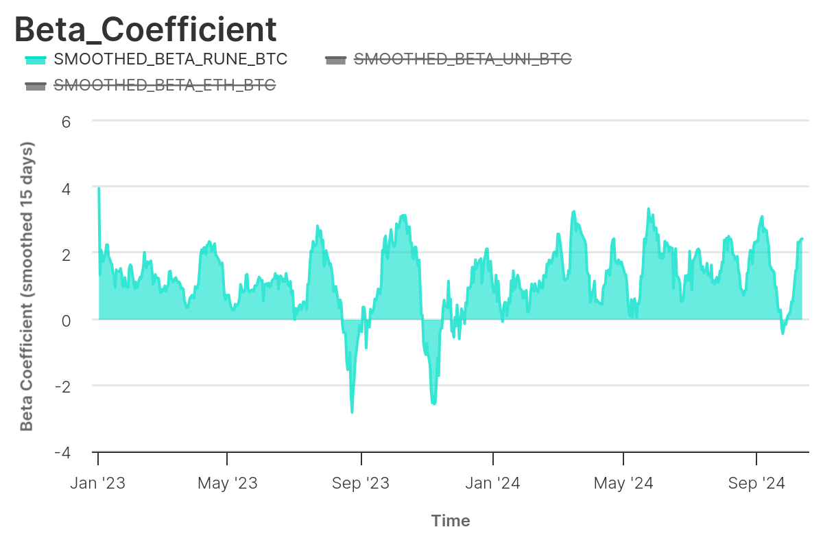 However, an interesting pattern emerges when new features are introduced. For instance, in August 2023 and October 2023, the beta coefficient of RUNE against BTC dropped to around -2.8. This shift coincided with the launch of streaming swaps and lending, which significantly impacted RUNE's correlation with BTC.