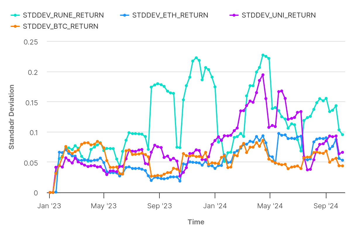 As shown in the chart below, which compares RUNE's volatility to assets like ETH, BTC, and UNI, RUNE consistently exhibits significantly higher volatility. While this volatility may attract traders looking for quick gains, and holders may enjoy rapid price surges driven by speculation around new features or upgrades, it poses serious challenges for Liquidity Providers and Node Operators.