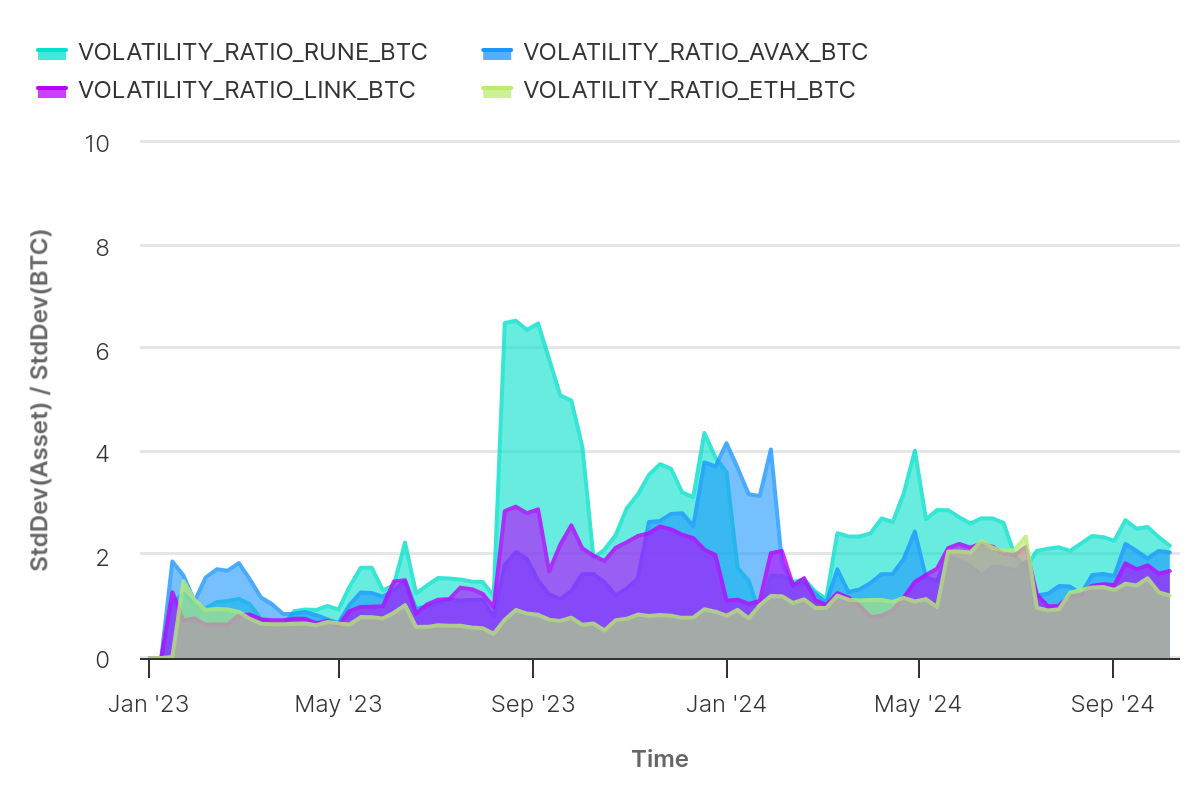 The chart below provides a comparative analysis of RUNE's volatility ratio against BTC, AVAX, LINK, and ETH, covering the period from January 2023 to the present. This ratio is calculated by dividing the standard deviation of each asset’s price by that of BTC. A ratio equal to 1 means that the asset's volatility is similar to Bitcoin's. A ratio greater than 1 provides a rough estimate of how much more volatile the asset is compared to Bitcoin.