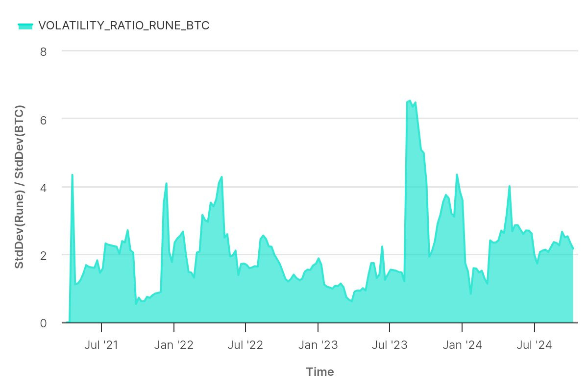 Setting aside the specific features introduced by THORChain, RUNE’s volatility generally fluctuates between 1.5 and 3, and has remained relatively stable since the start of 2024 (excluding the spikes caused by the ADR012). This is a positive sign, and if the ratio could decrease and stabilise within the 1.5 to 2 range, RUNE's volatility would be comparable to that of major, well-established projects.